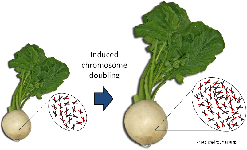 Polyploids often have larger cell and organ sizes than diploids. Hence, induced polyploidy, where chromosome numbers within a species are artificially doubled, has great potential for plant breeding, particularly of root and vegetable crops. In turnip (diploid Brassica rapa) and related vegetable species, targeted breeding efforts in the 1970s and 80s resulted in the successful release of a number of tetraploid crop types. However, these polyploid induction breeding strategies were hindered by problems such as poor fertility and vigour, and were subsequently abandoned. We propose to use modern genotyping, sequencing and cytogenetics technologies to identify the factors responsible for success and failure of induced polyploidy breeding in these crops. Such hybrids have immense potential for yield improvement as a result of increased heterosis, if stable tetraploid crop types can be created on demand.